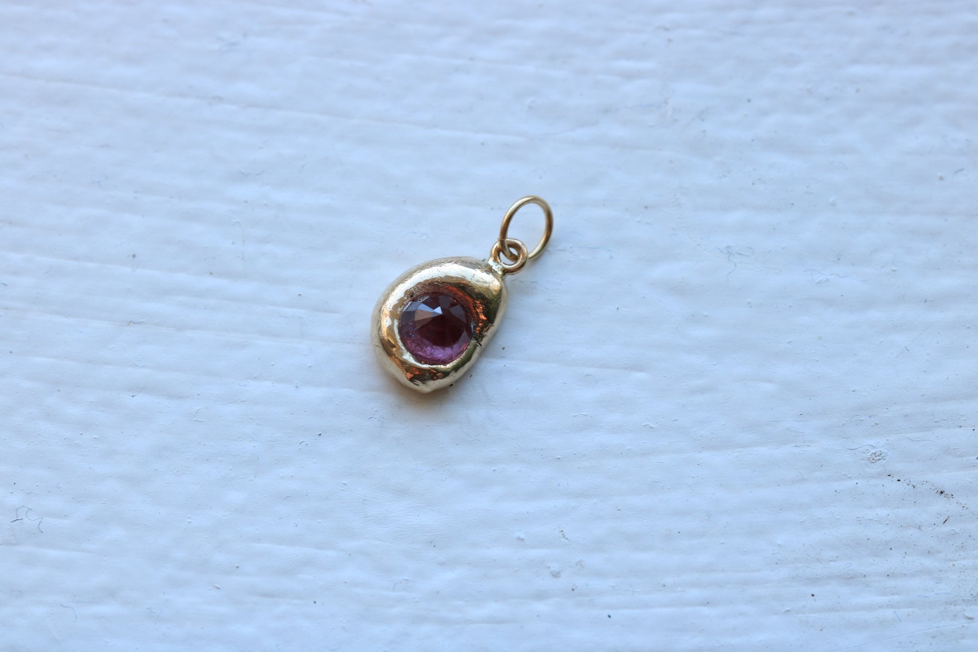 14k yellow gold blob with a direct set natural antique .4 ct mixed cut ruby. This ruby is set with the culet pointed out to see the amazing underside faceting and color pop in the light. Comes on a 5mm jump ring so the charm can be added to existing chains. Gold weight is approx 1.2g.