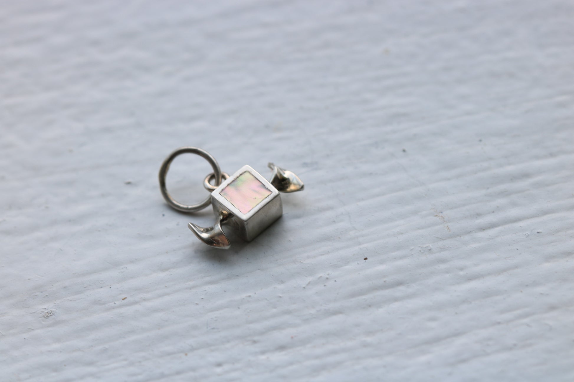 Sterling silver 4x4mm candy charm inlaid with 1970’s abalone. Bail has a 5mm opening. Comes on a silver box chain!
