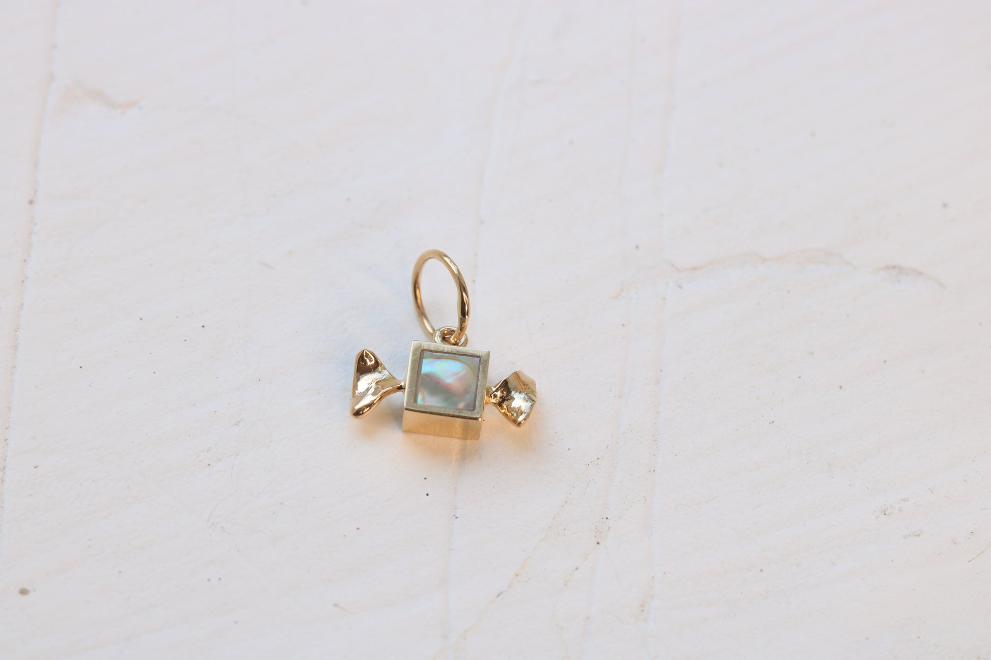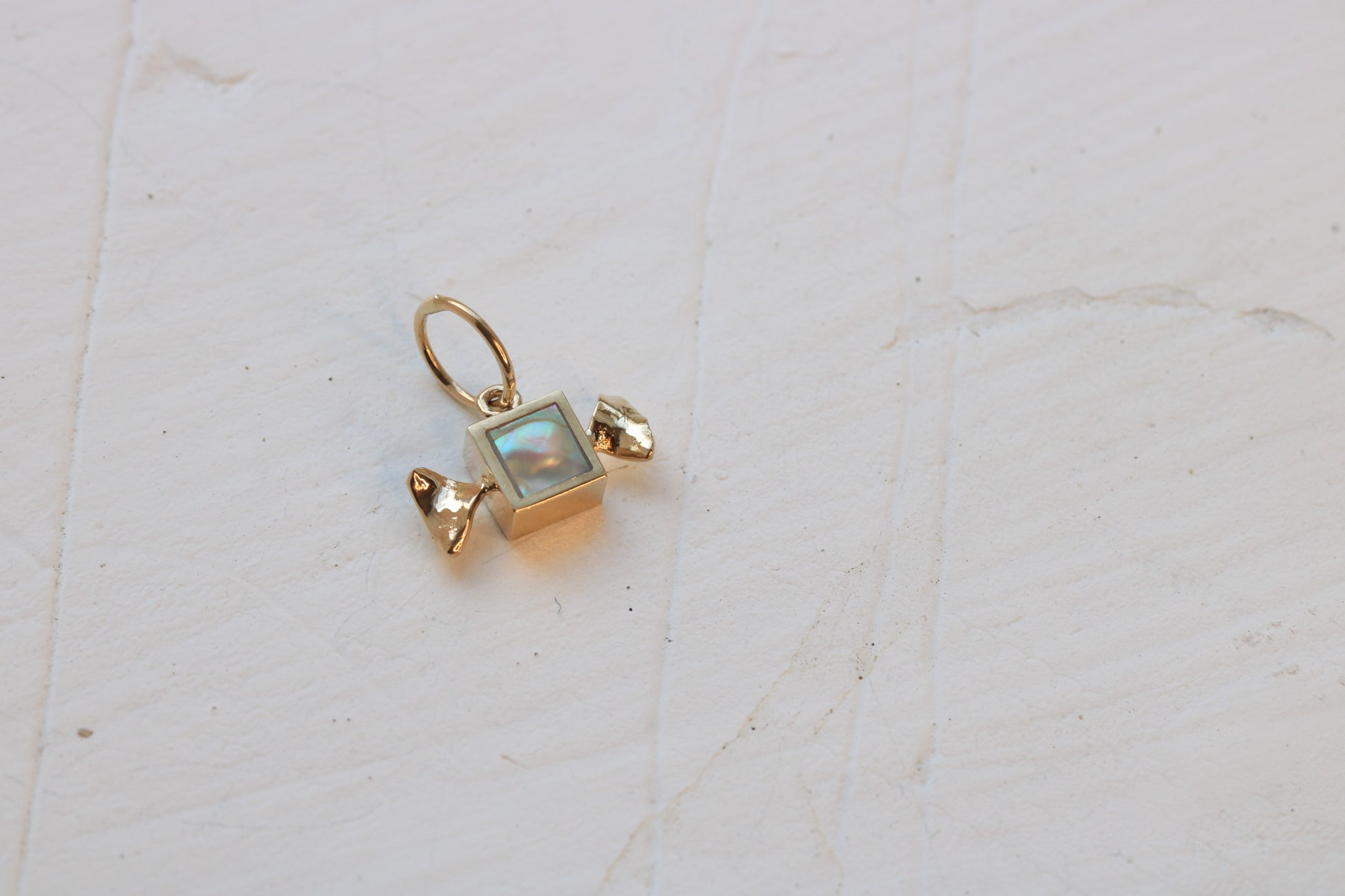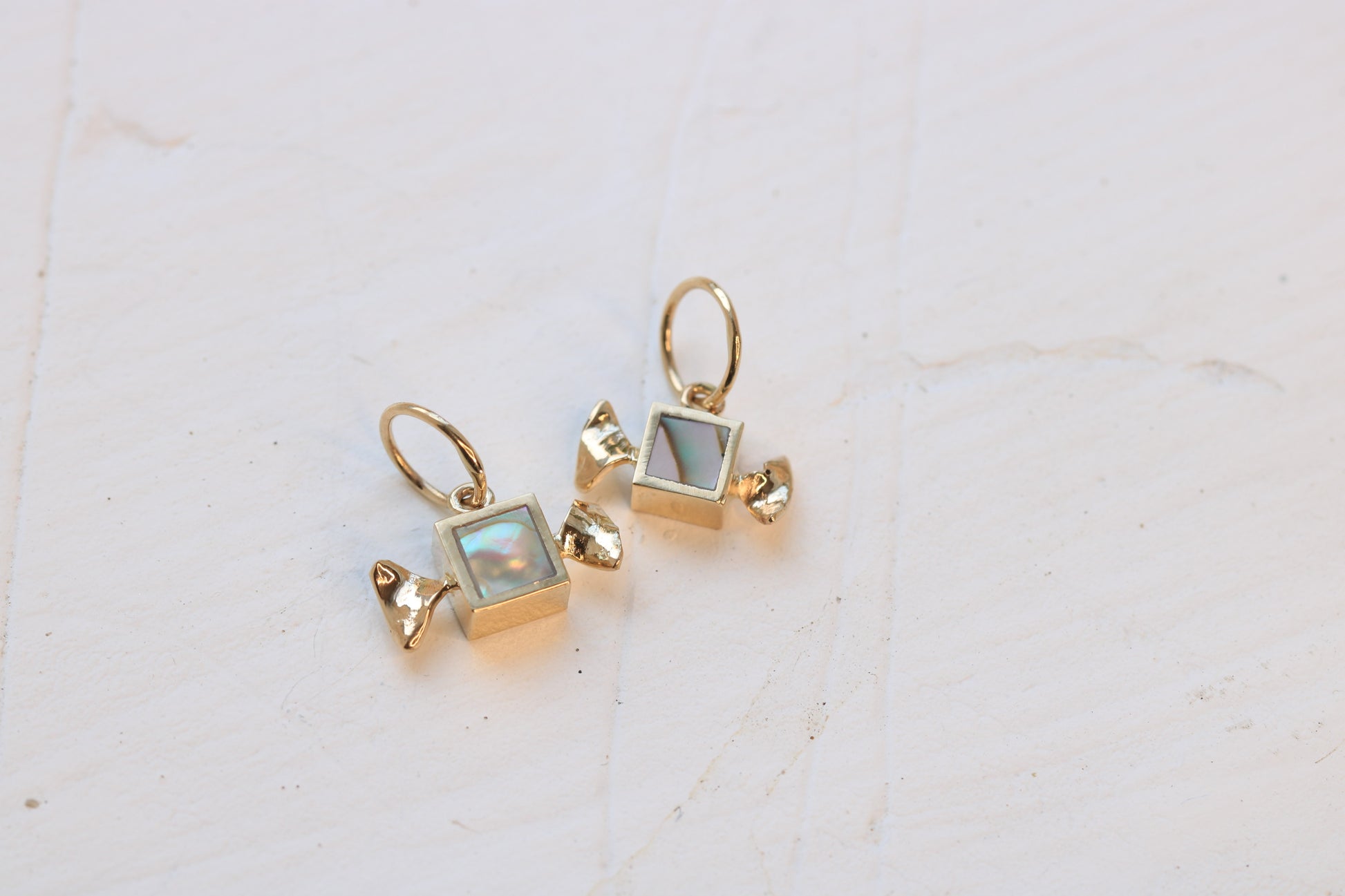 Solid 14k yellow gold 5x5mm square with inlaid abalone. This abalone was gifted to me by my dad's friend, Walter, who dove for them off the coast of Southern California in the 1970's. Divining for abalone is illegal in the U.S. now, and ones as large as the ones I was gifted don't really exist anymore!