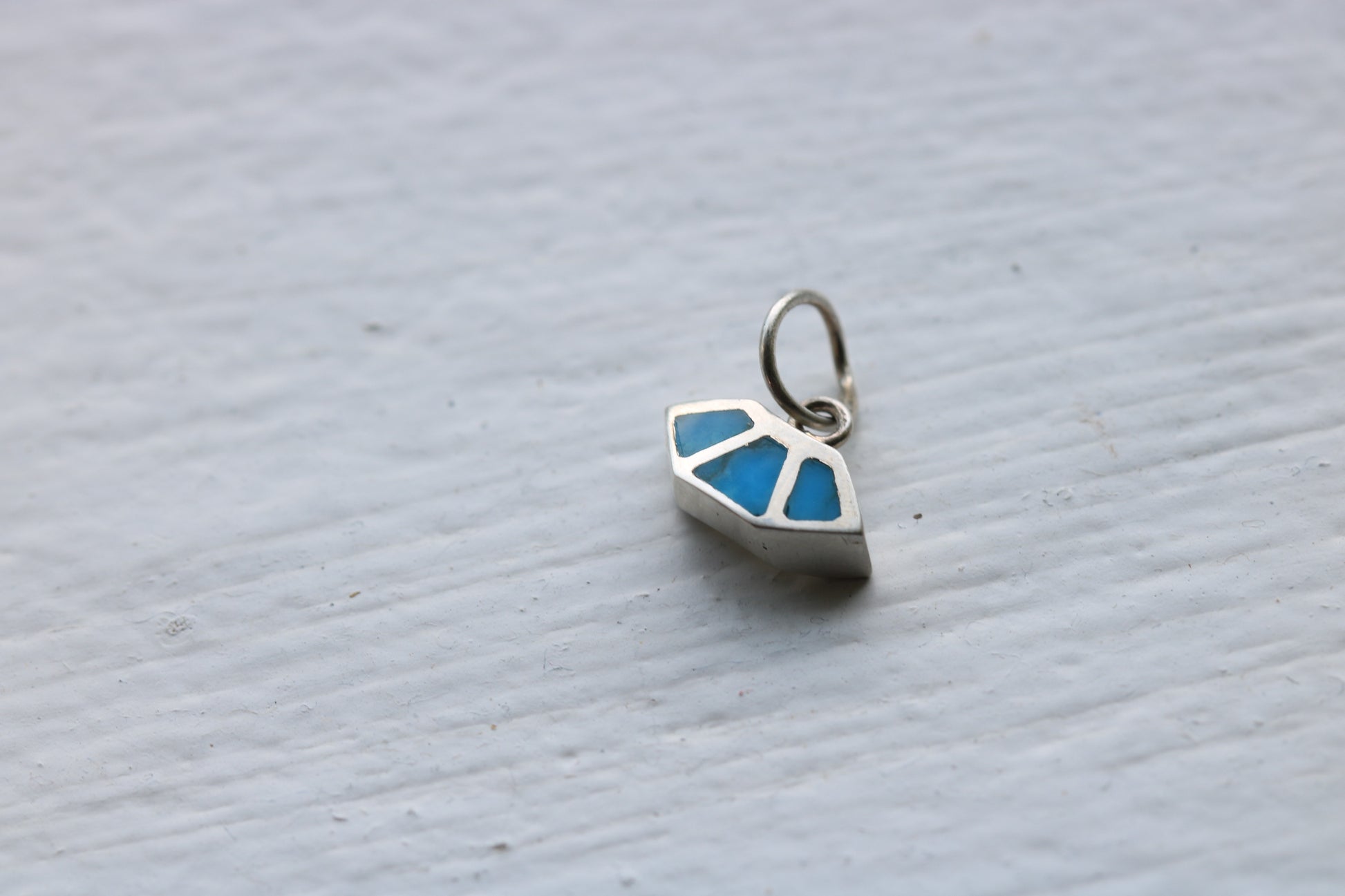 Sterling silver fan charm inlaid with Kingman turquoise. Bail has a 5mm opening. Comes on a silver box chain!