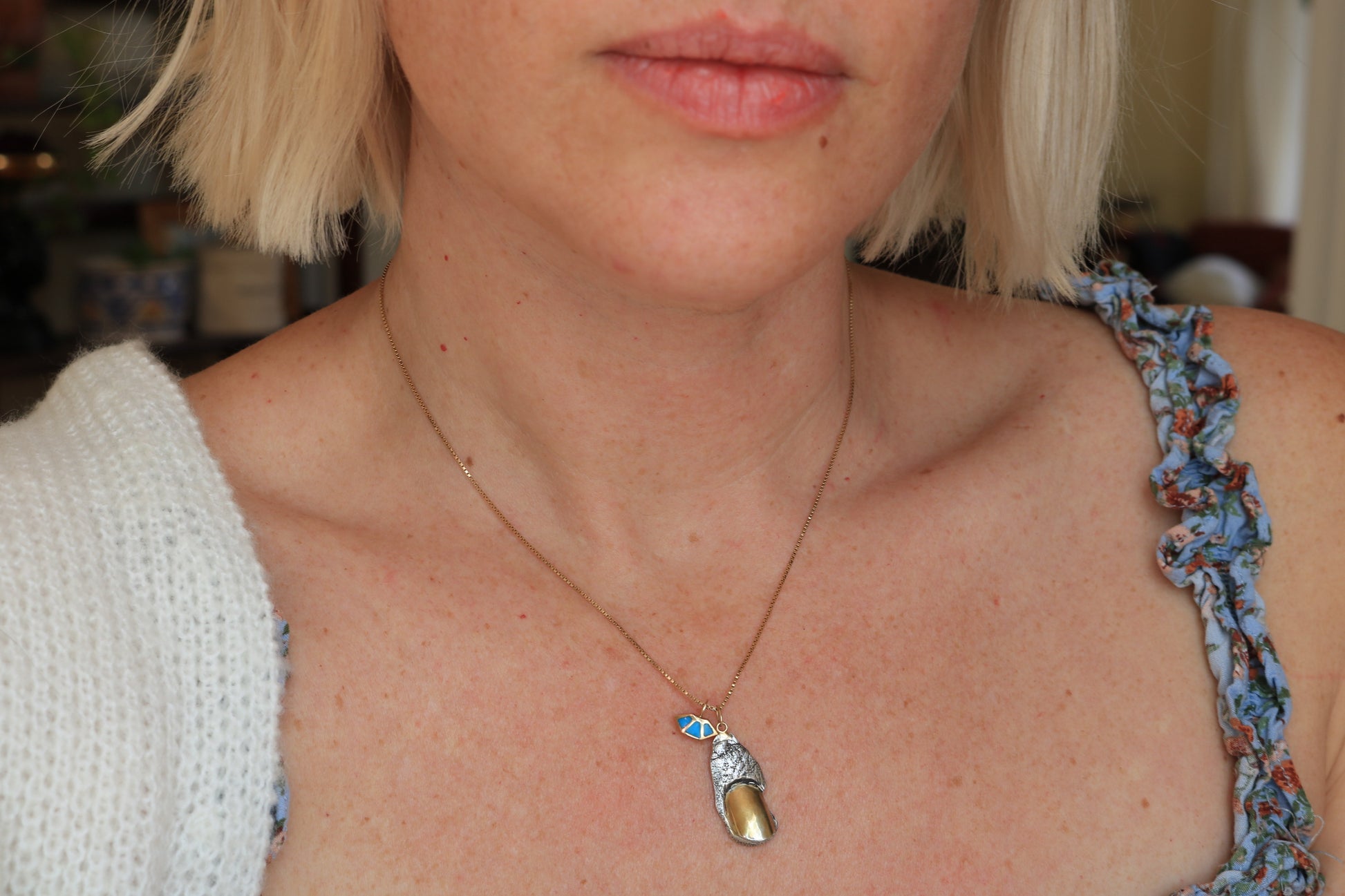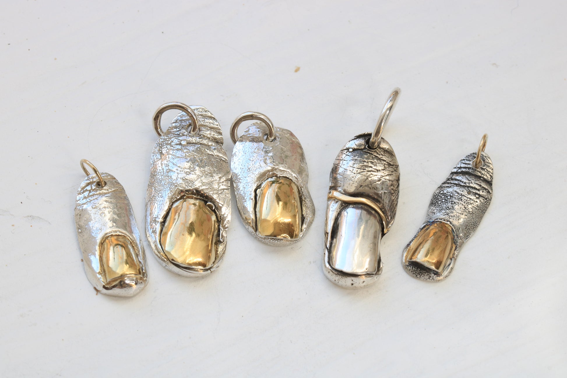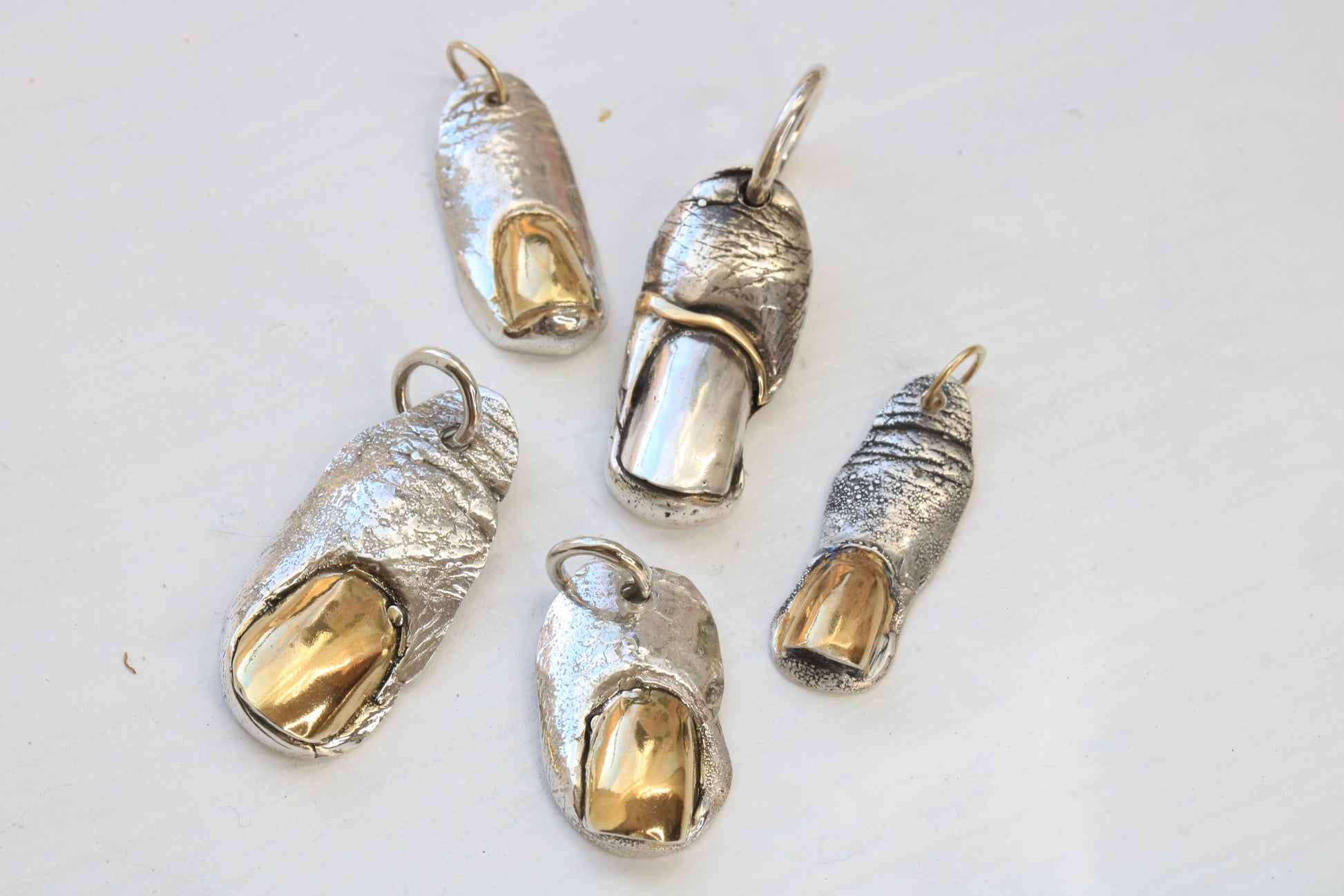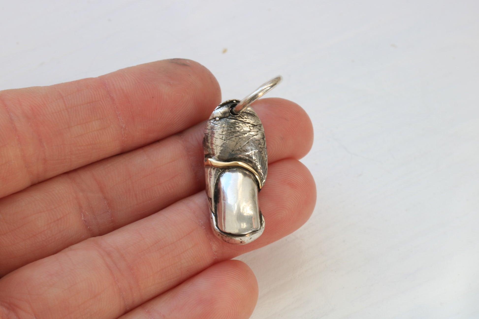 Sterling silver body cast fingertip with a 14k gold stripe. Bail is 5mm in diameter and can fit on most existing necklace chains!