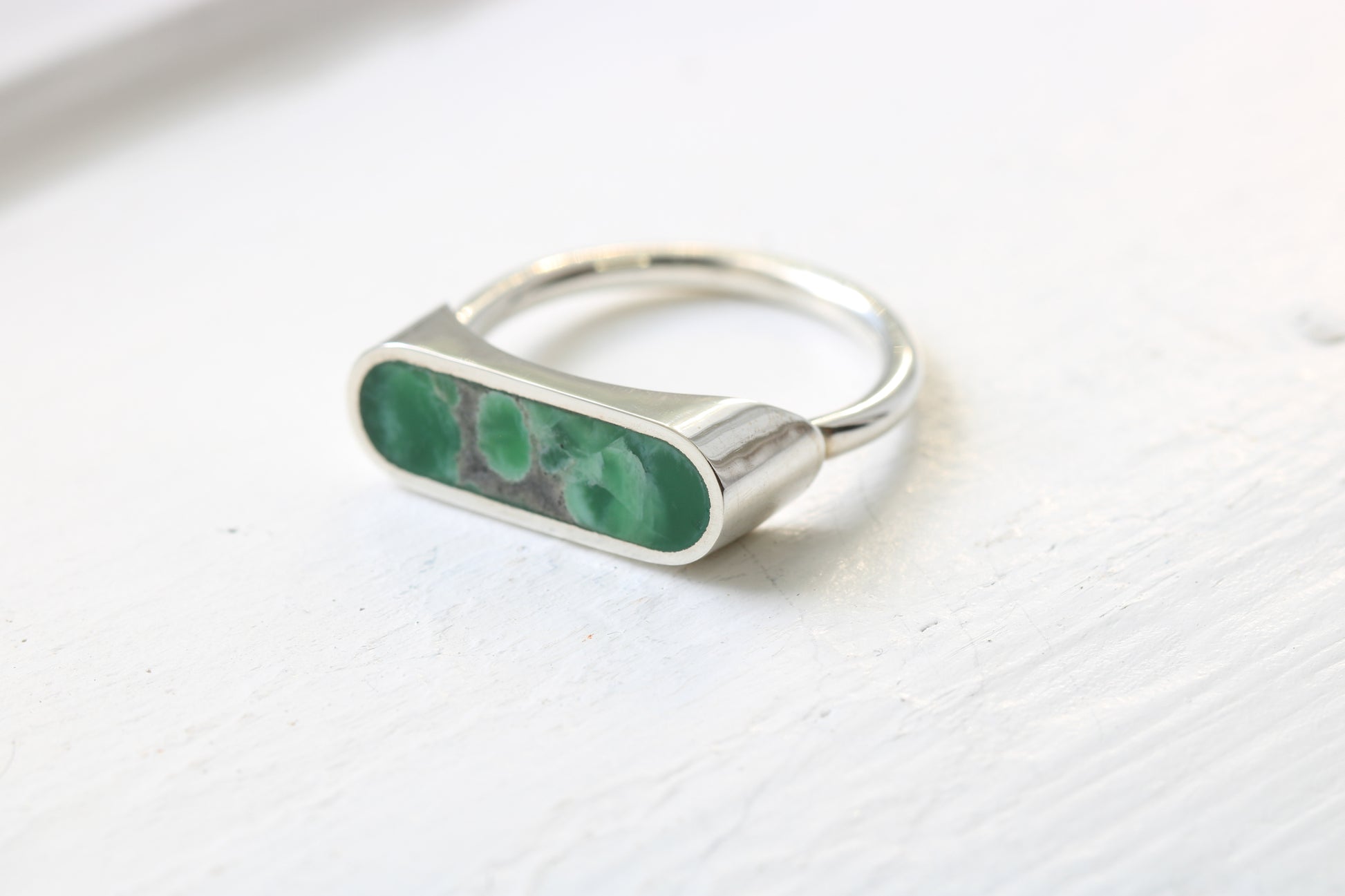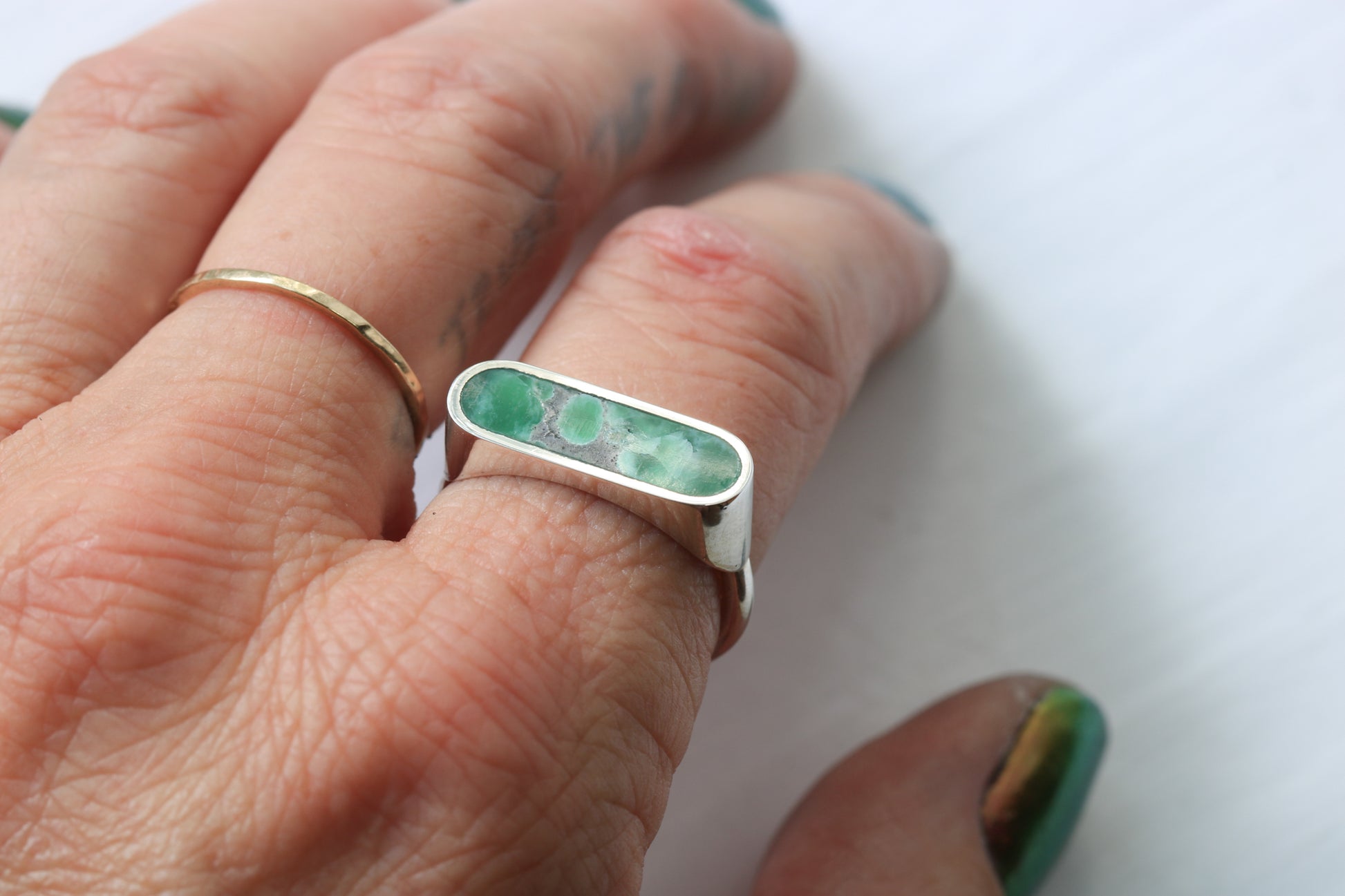 Solid sterling silver with Varisite inlay. Size 7, but can be sized.