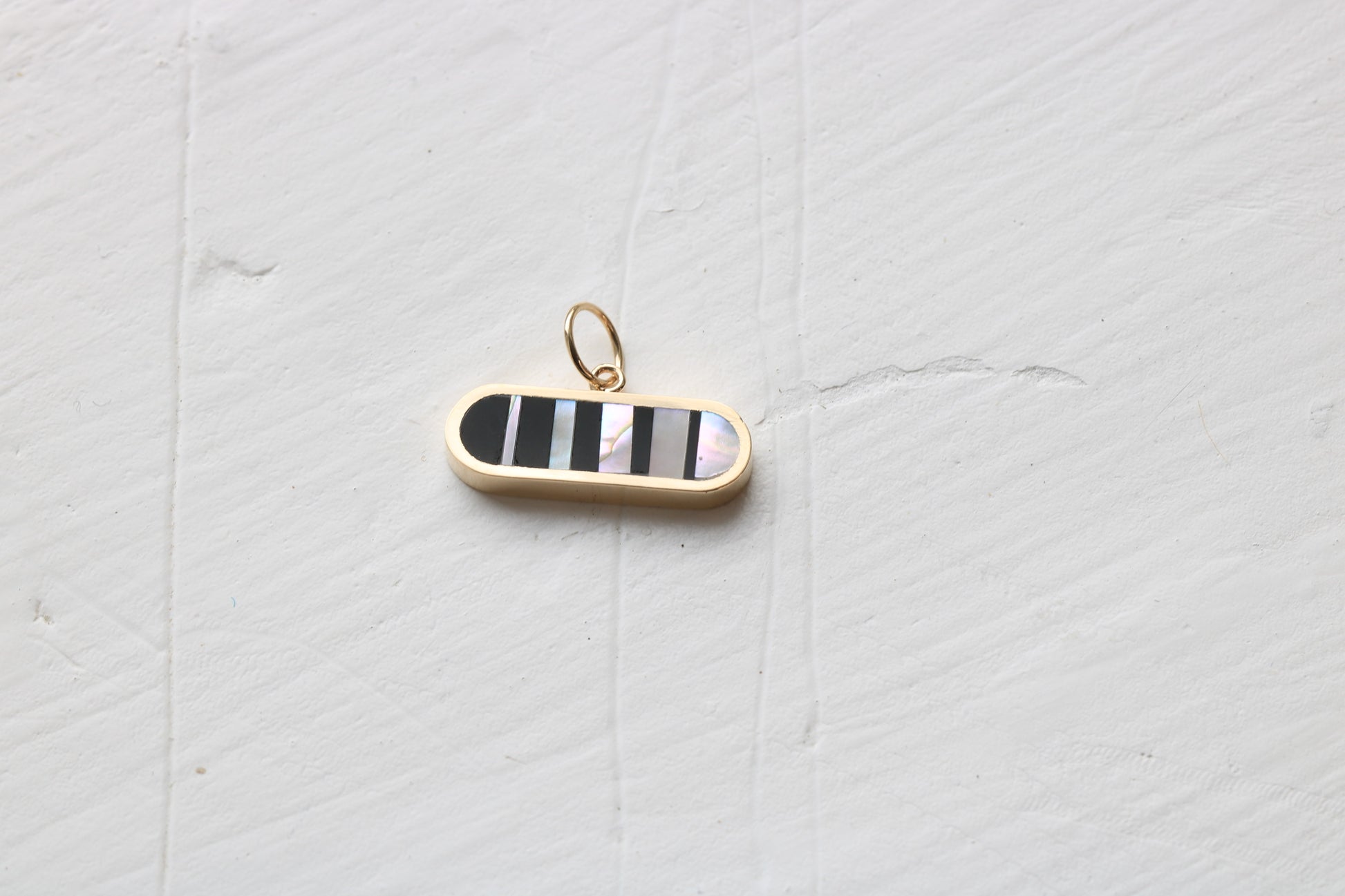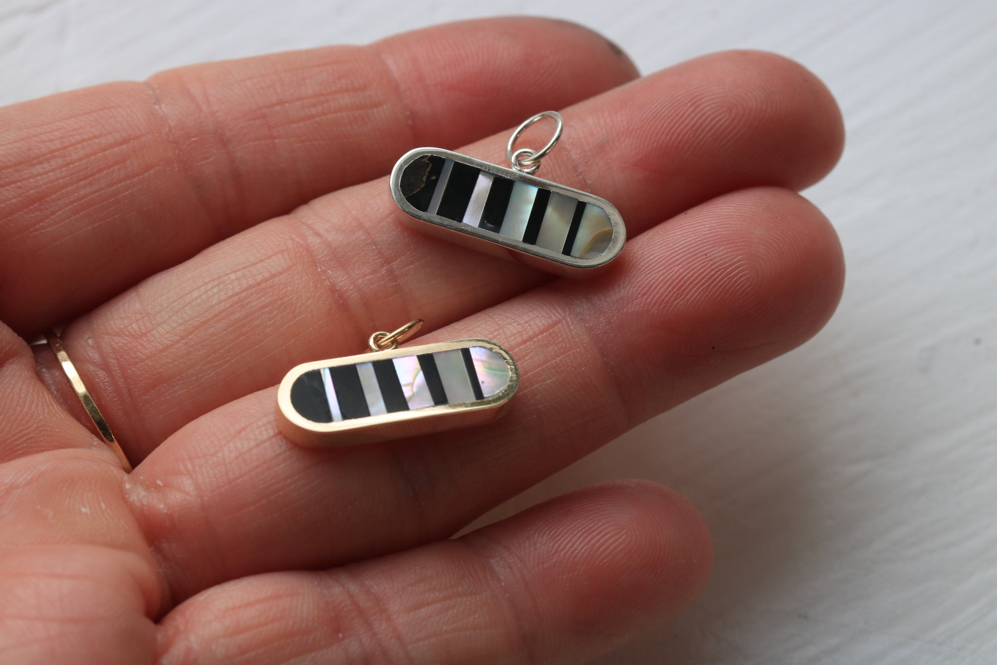 20mm wide solid 14k yellow gold oval inlaid with black petrified wood and 1970's abalone in an infinity illusion pattern.