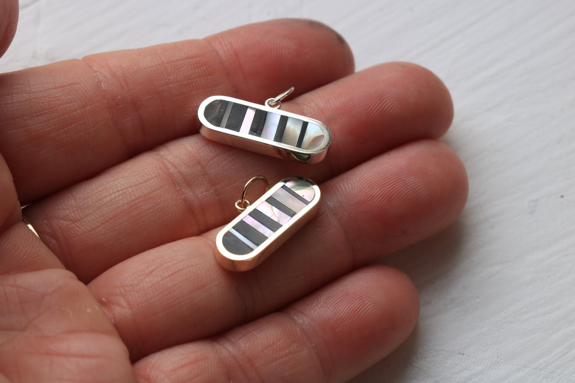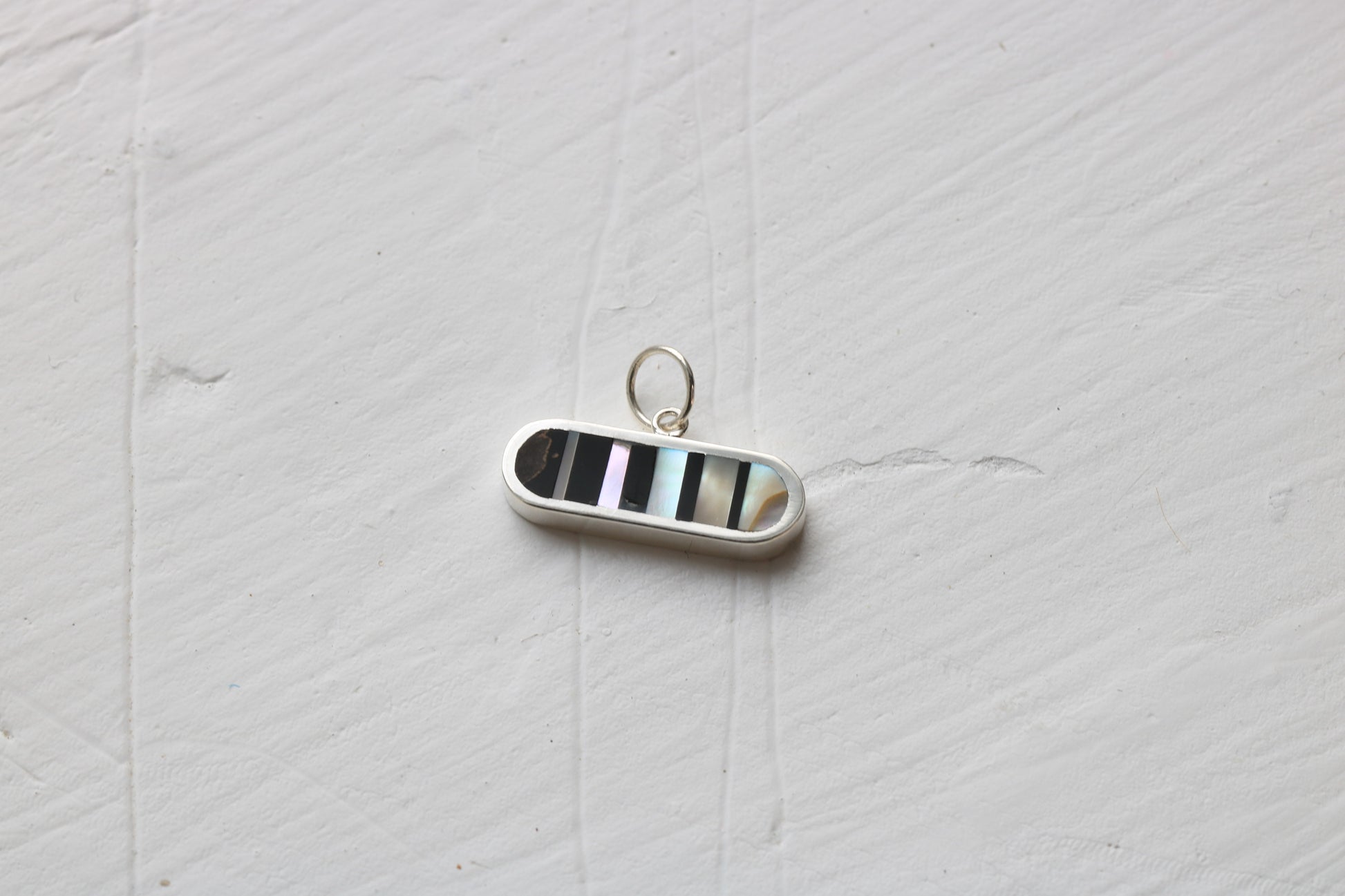 20mm wide sterling silver oval inlaid with black petrified wood and 1970's abalone in an infinity illusion pattern.