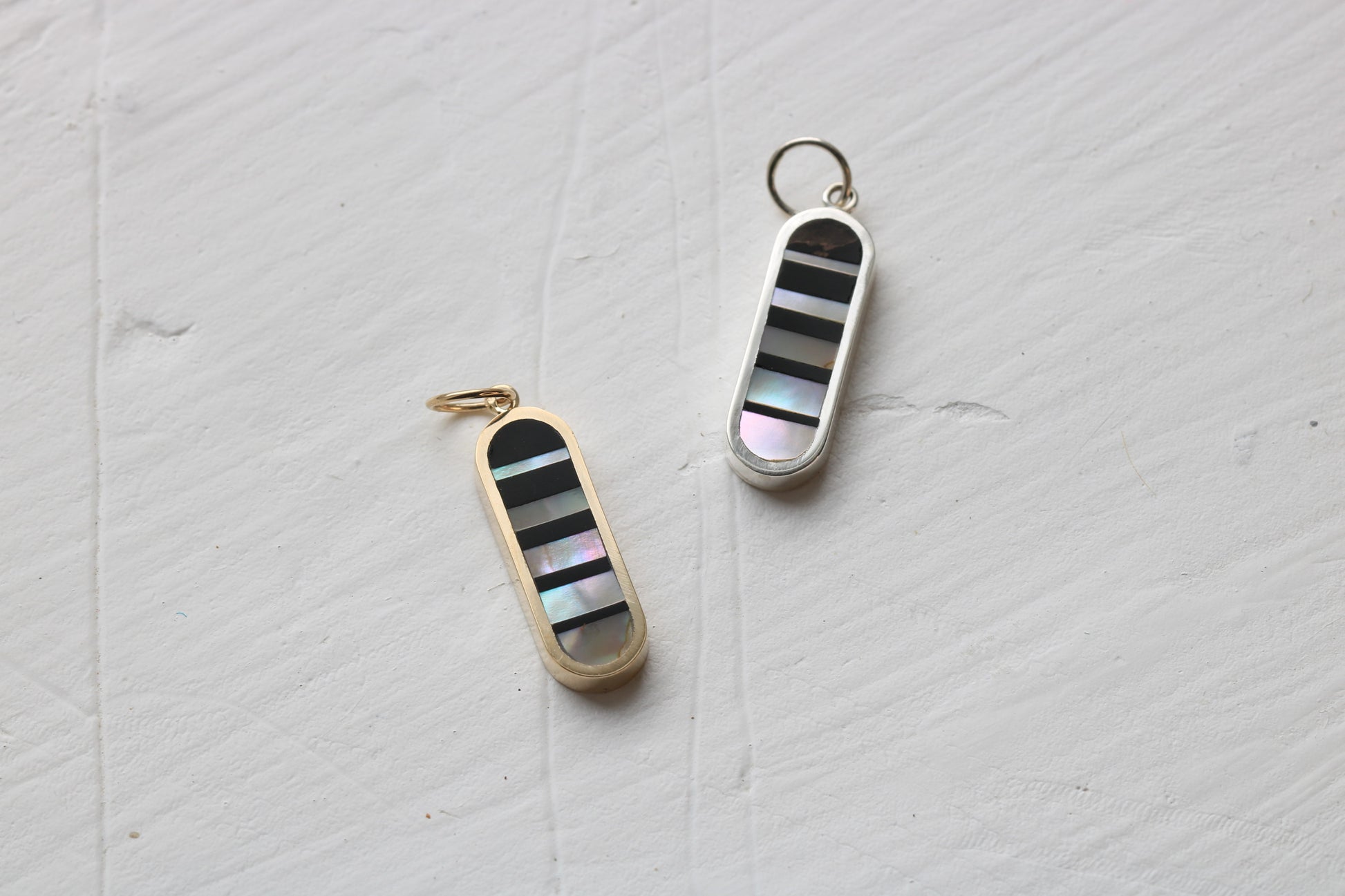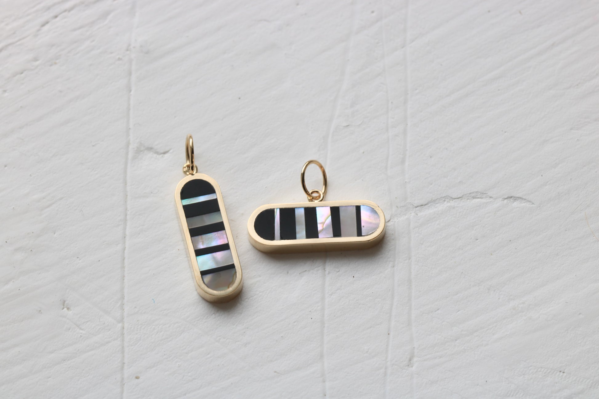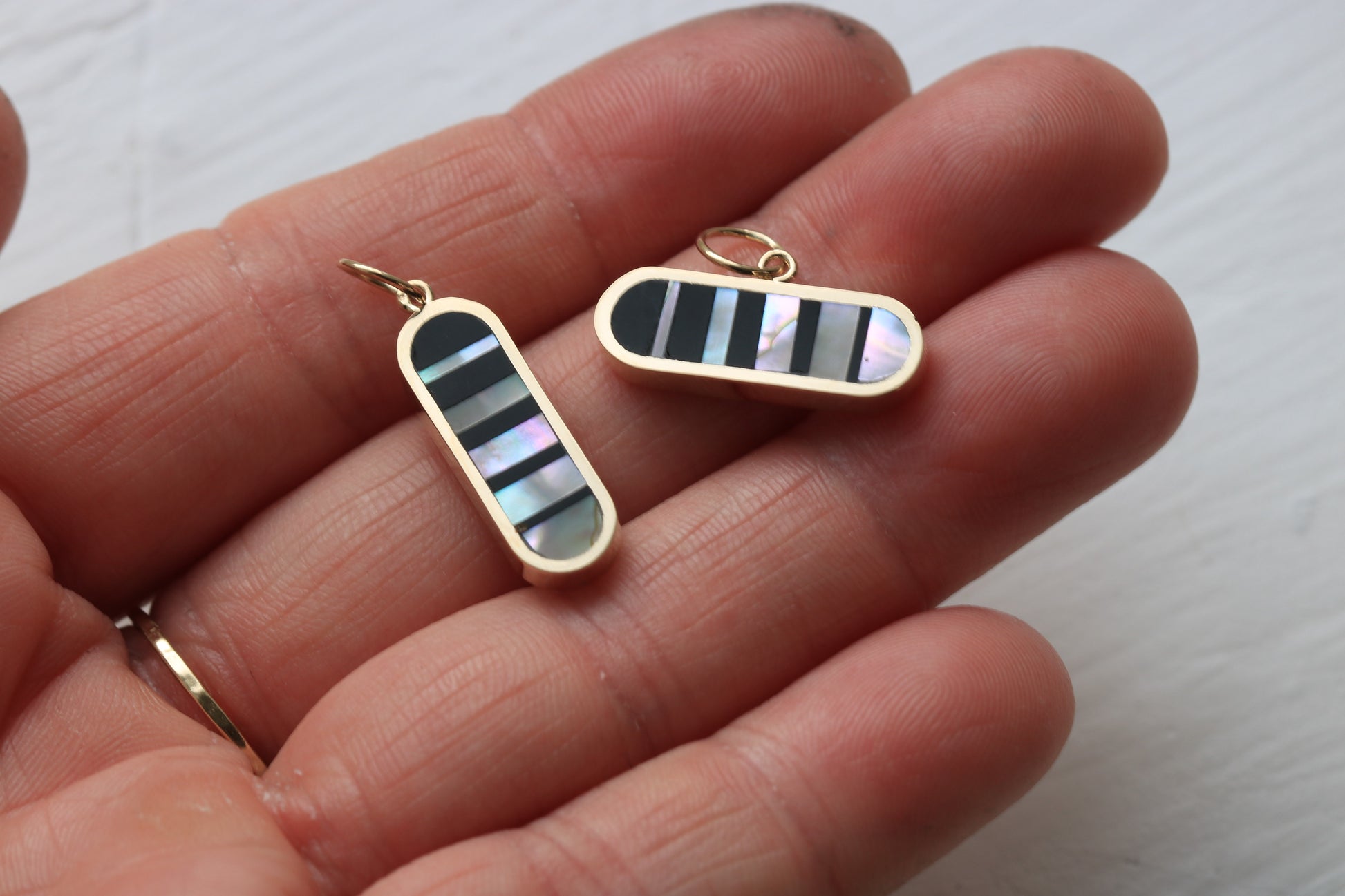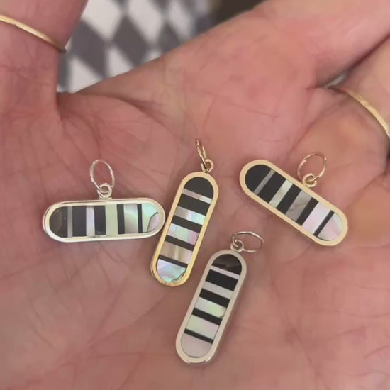 20mm long solid 14k yellow gold oval inlaid with black petrified wood and 1970's abalone in an infinity illusion pattern.