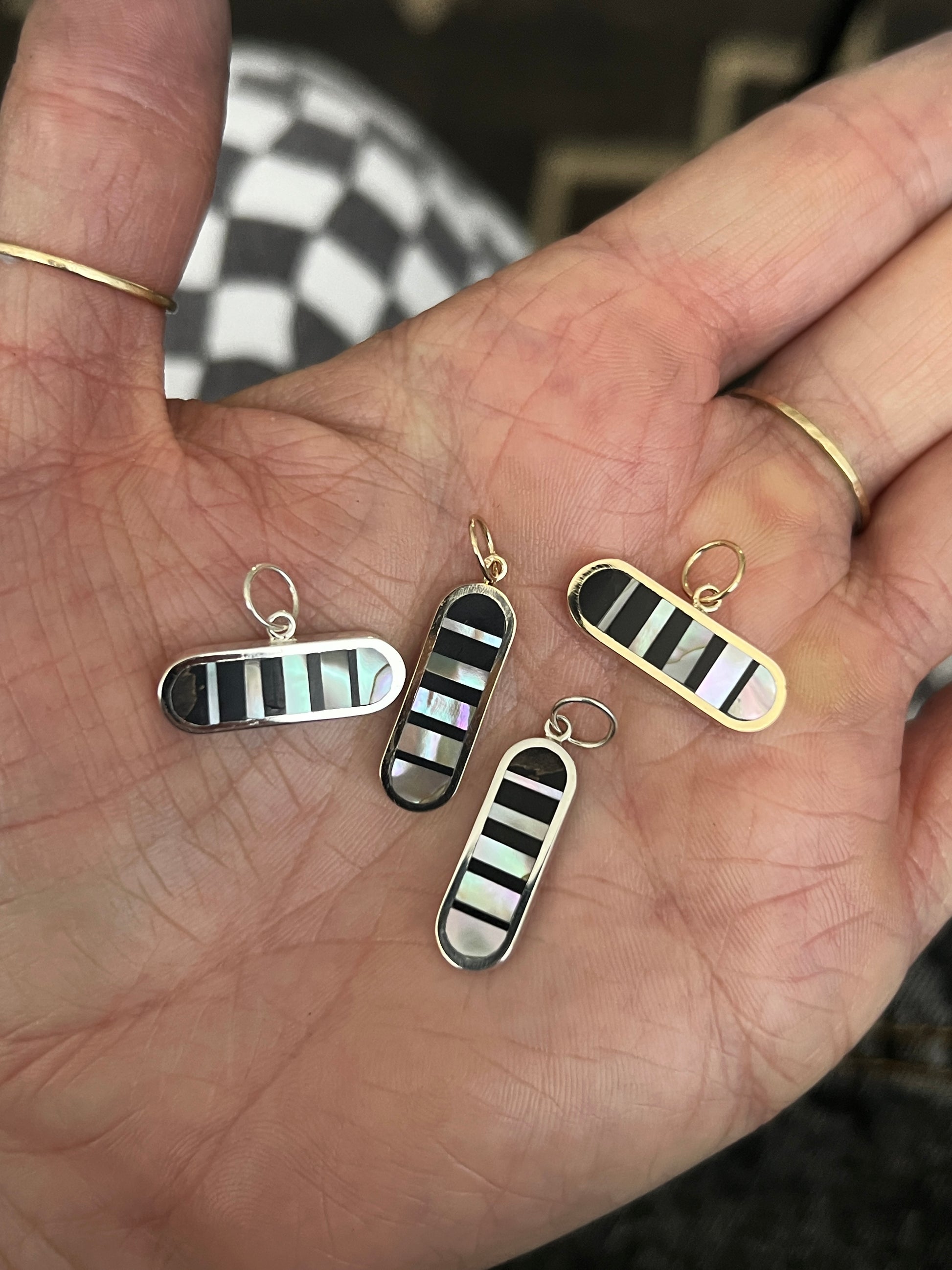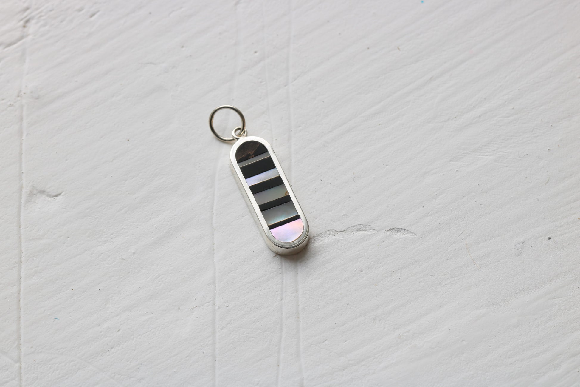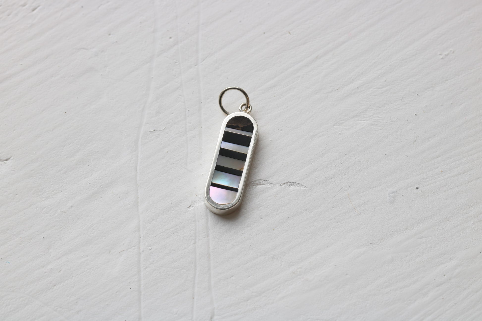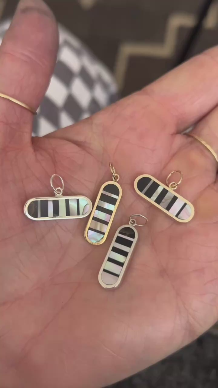 20mm long sterling silver oval inlaid with black petrified wood and 1970's abalone in an infinity illusion pattern.