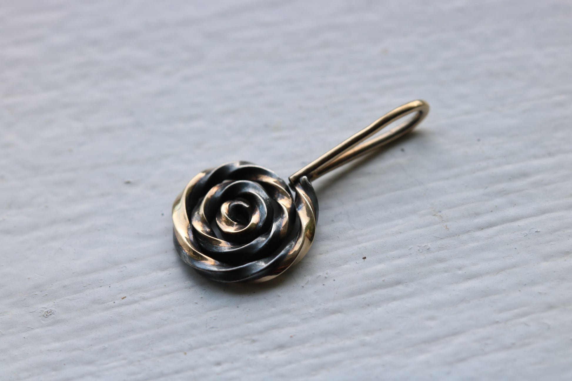 Sterling silver and 14k gold lollipop charm. Lollipop stem is 14k gold and the candy portion is a soldered together and twisted sterling and gold combo. Silver is oxidized.