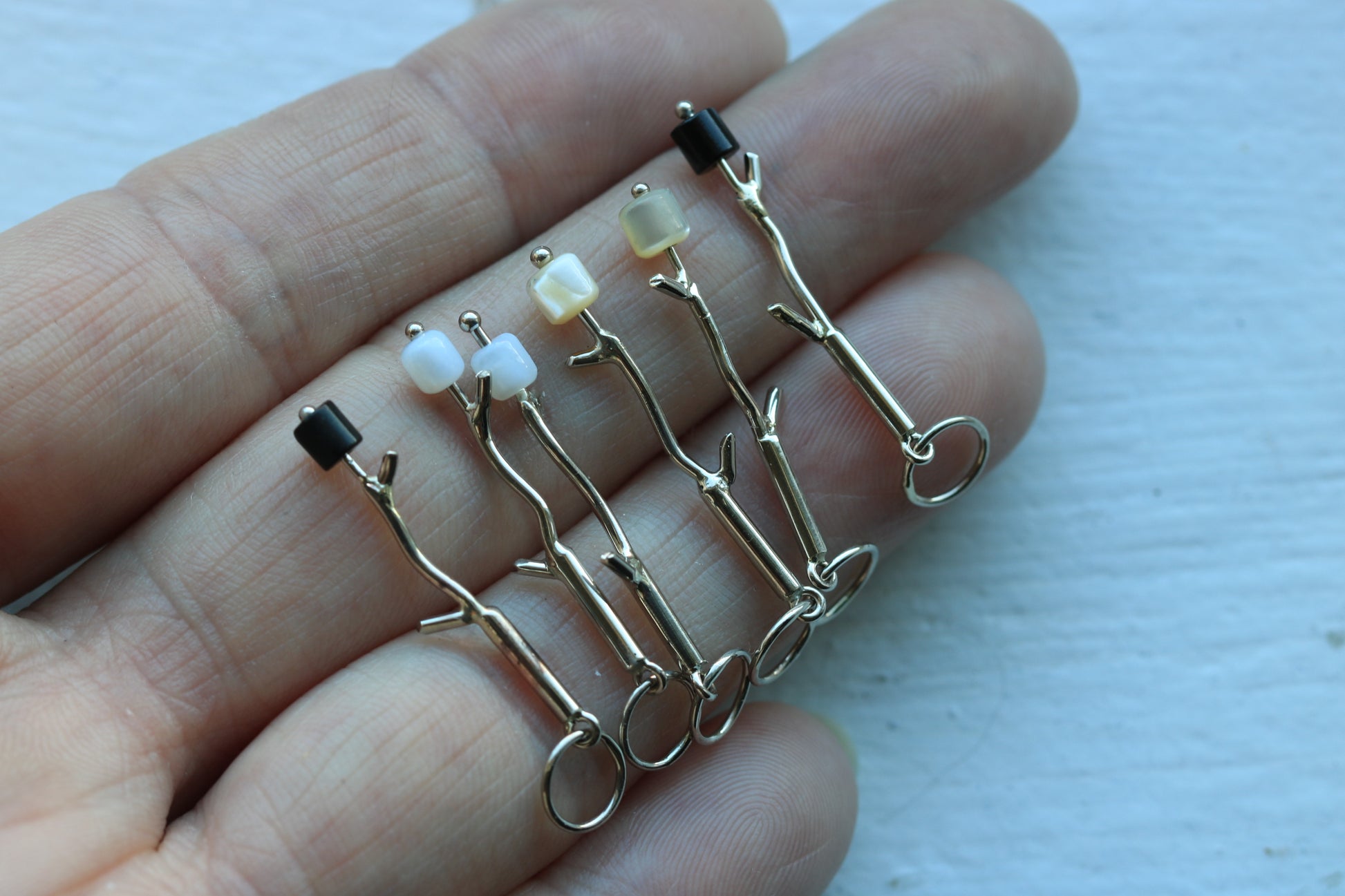 Solid 14k white gold high polish branch with a bright white mother of pearl marshmallow! Branches are approximately one inch long and hang on a 5mm bail.