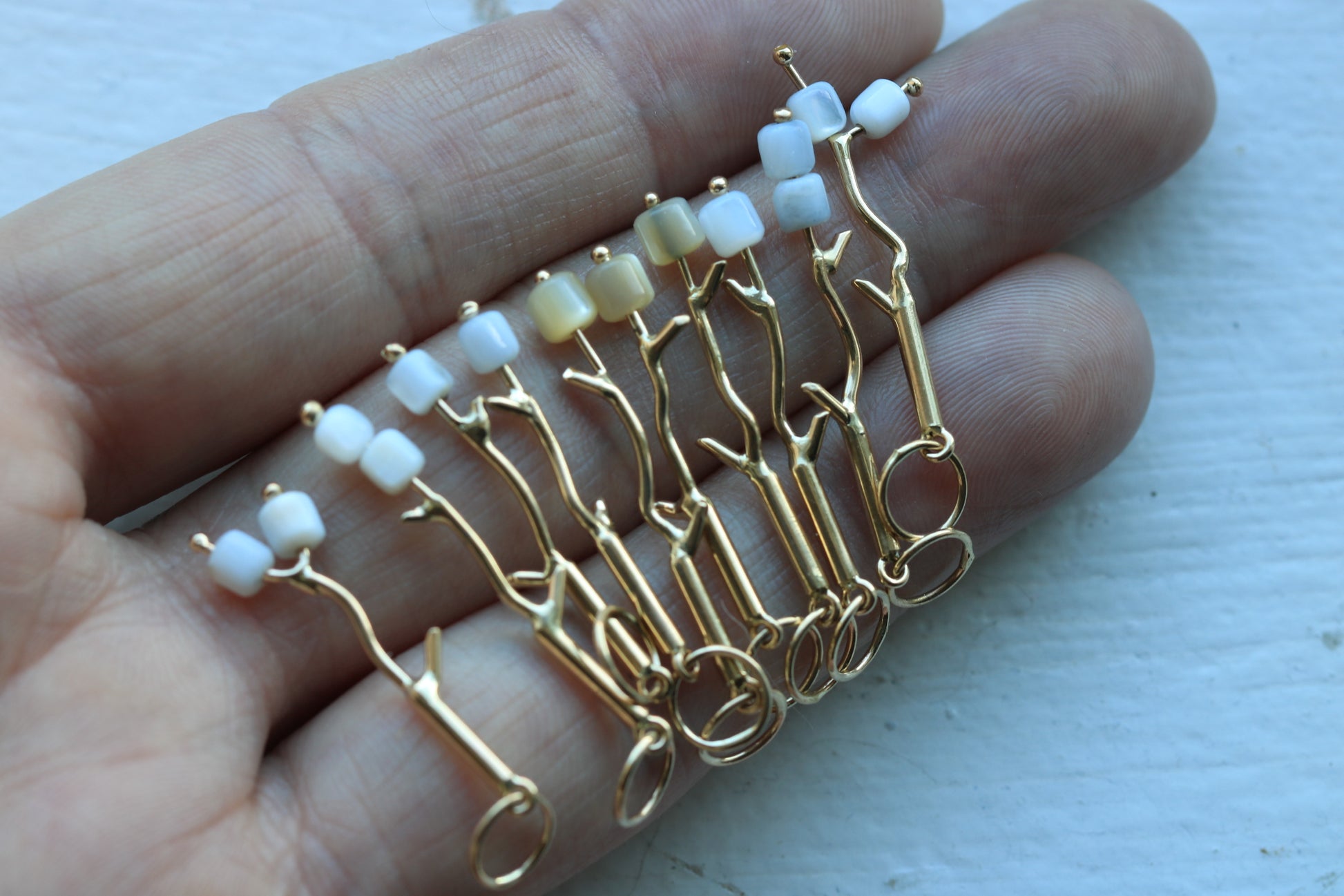Solid 14k yellow gold high polish branch with two bright white mother of pearl marshmallows! Branches are approximately one inch long and hang on a 5mm bail.