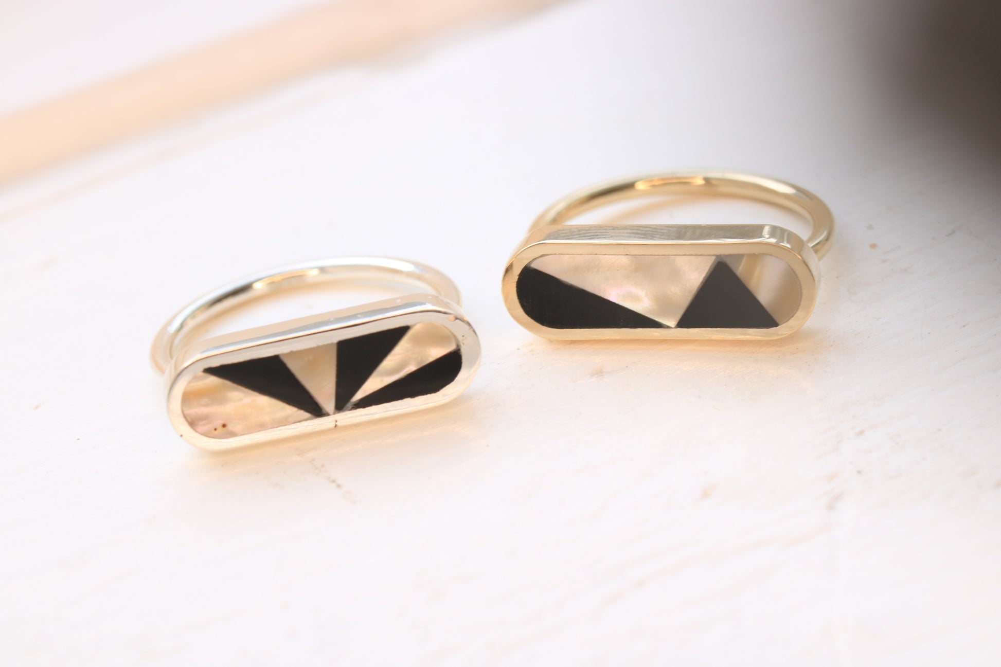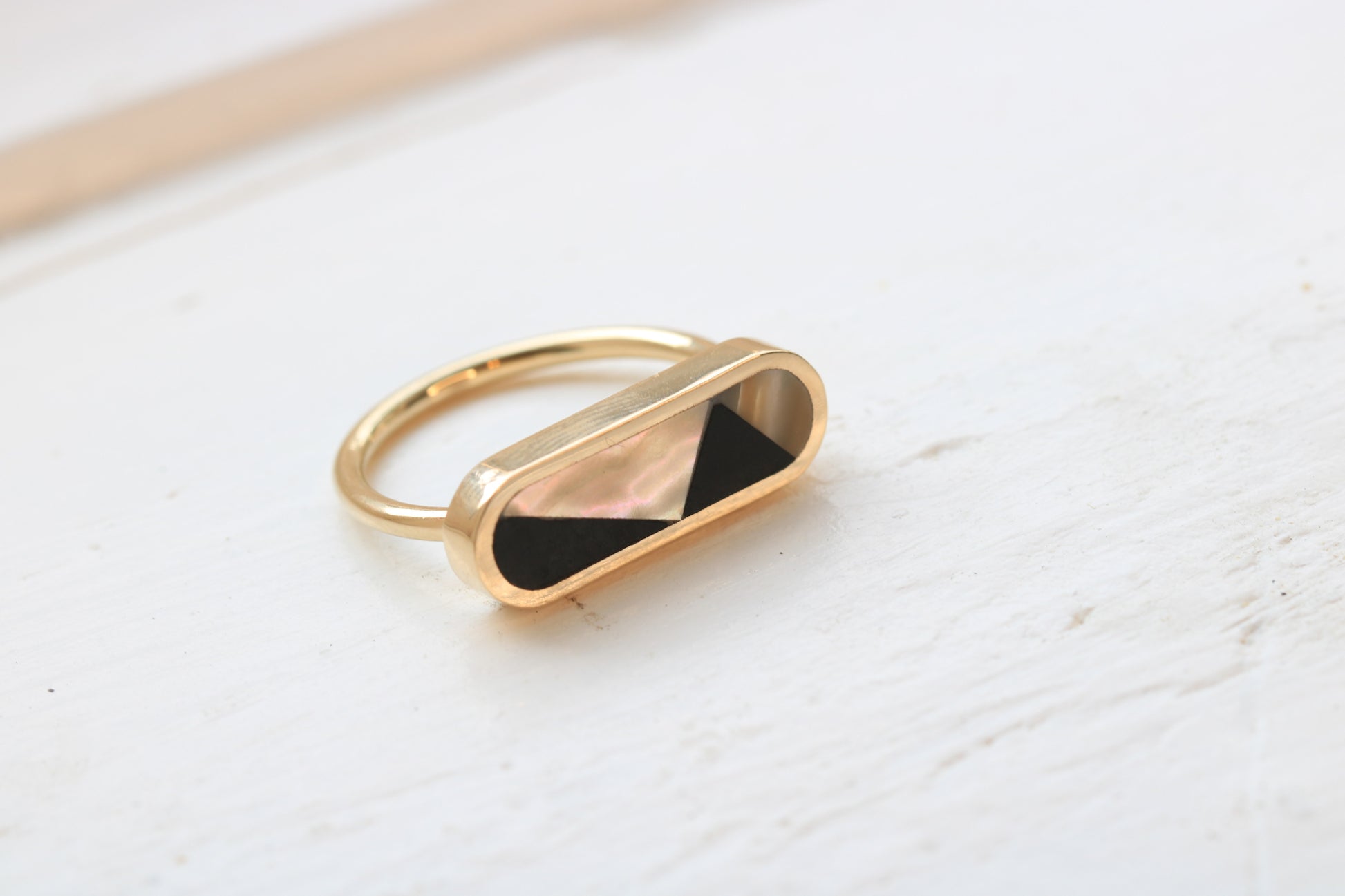 14k solid gold ring inlaid with 1970's abalone and black petrified wood. Currently a 6.25 but can be sized! Please let me know which size you need.