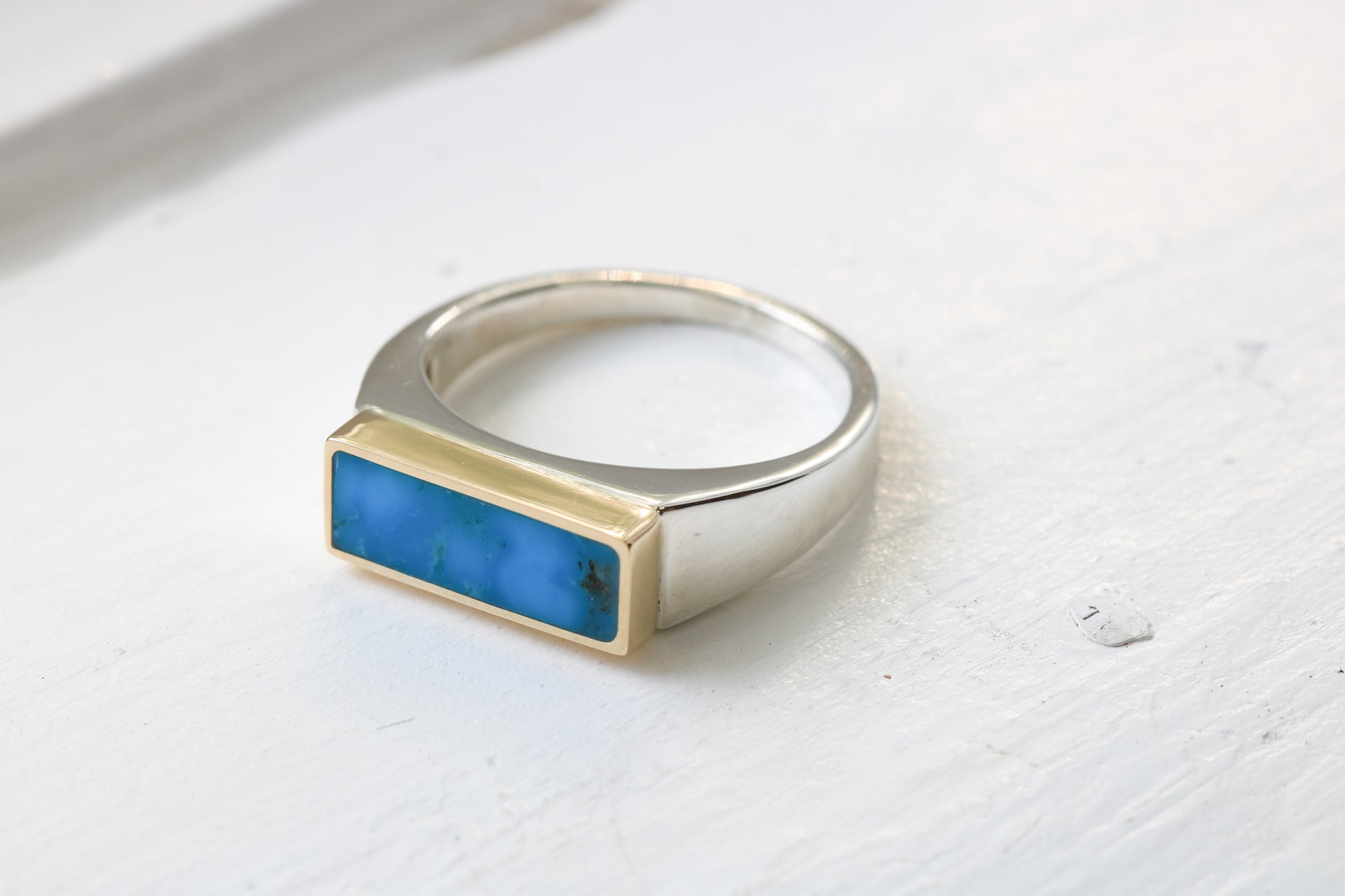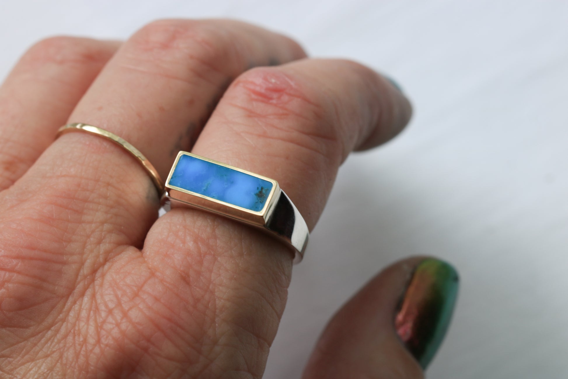 Sterling silver signet ring with a 14k yellow gold Kingman turquoise inlaid top. Size 7.25, but can be sized.