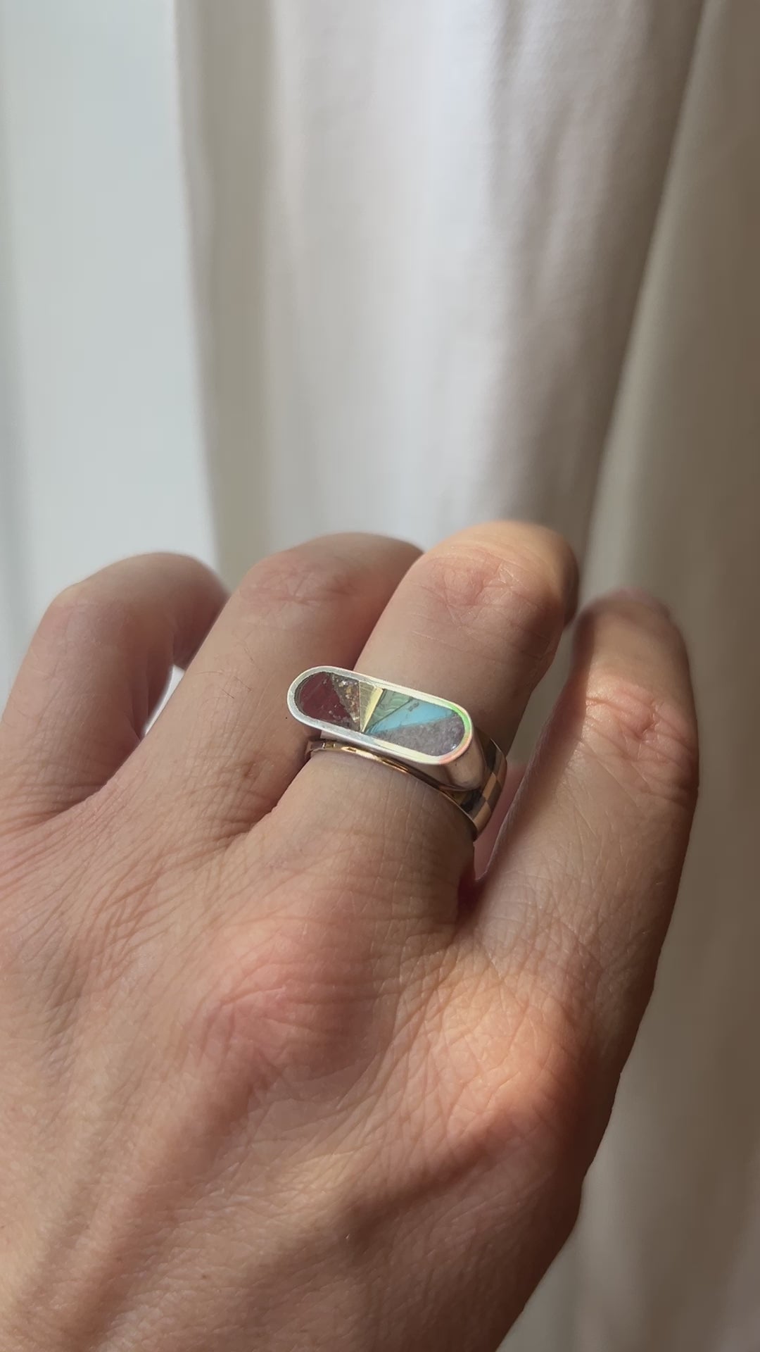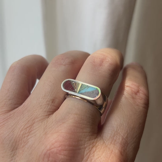 Hand-fabricated checkerboard cigar band of oxidized sterling silver and 14k gold. Sterling ring top with inlaid stone and 14k gold. Stones from red to purple are Dot's Plume, Sunstone, 14k gold, Malachite, Kingman Turquoise, and Lepidolite. Size 7.5. Can be sized up a half or full size, but not down!