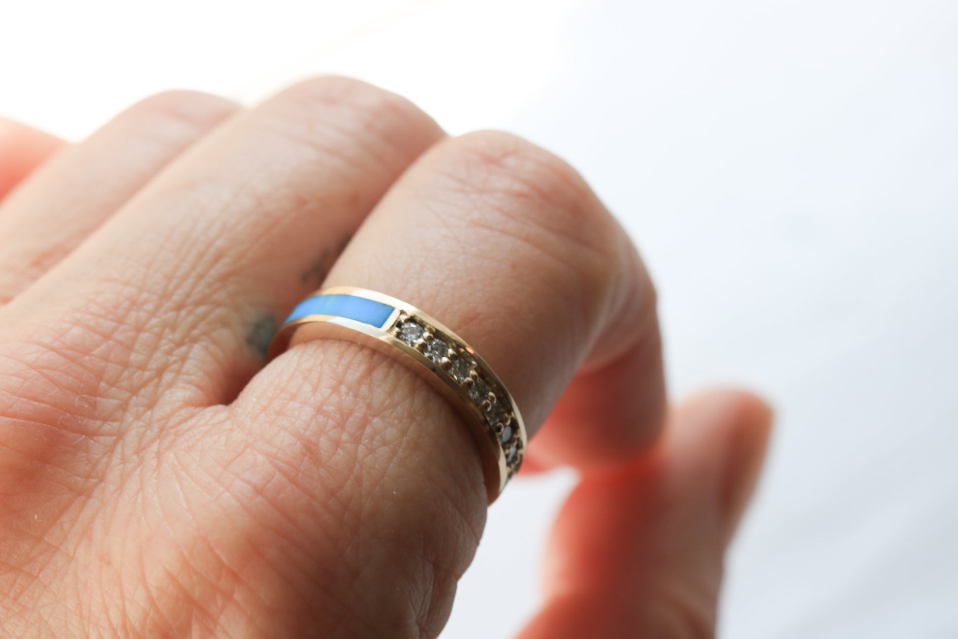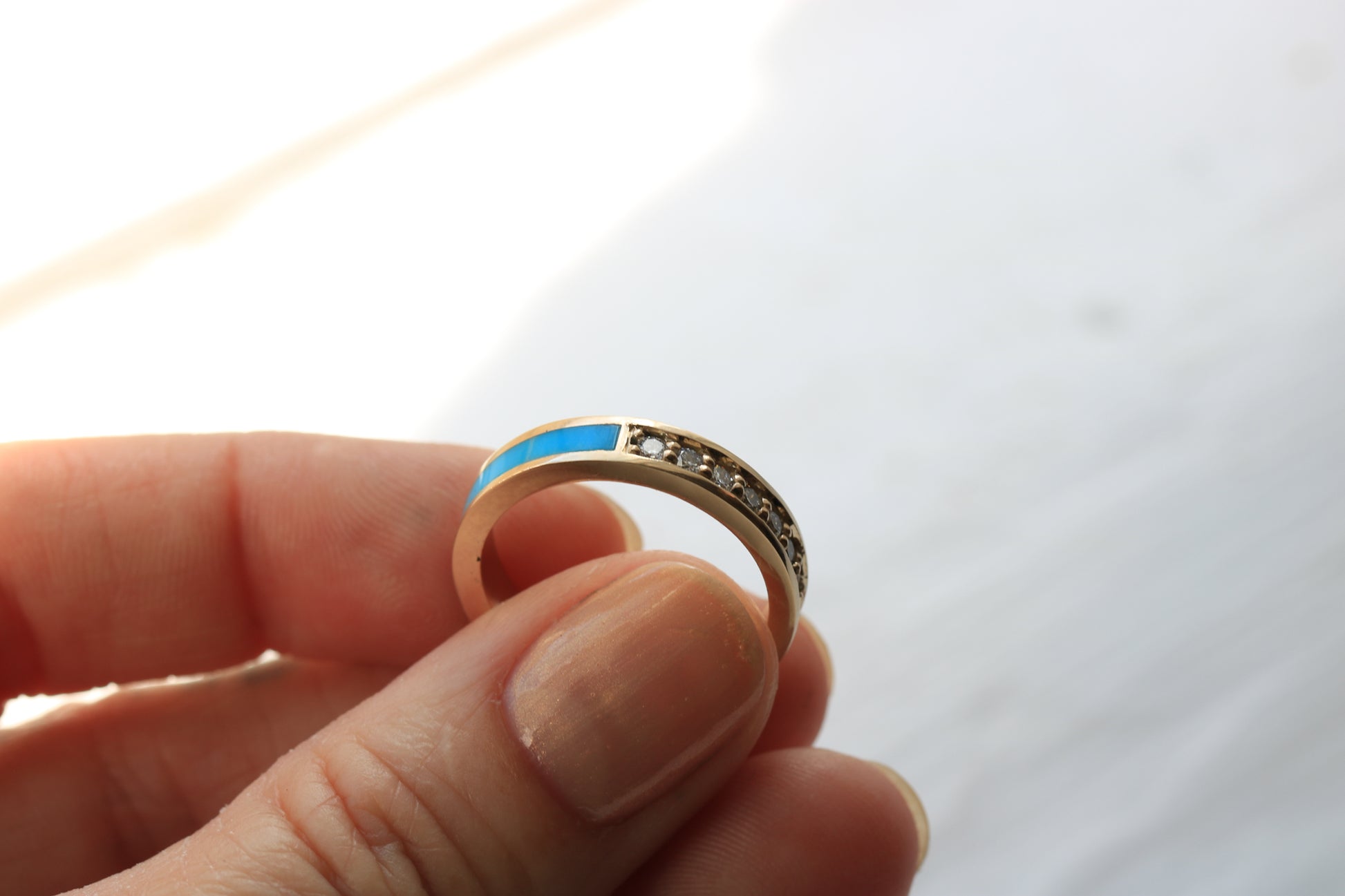 For those who want half sparkle and half earthy inlay. 14k yellow gold, 11 .03ct lab diamonds. These can be made with whatever inlay stone you like, and in any size! (custom orders require 6 weeks to create). Shown is one abalone inlay at a size 6.5, and Kingman turquoise inlay at size 7.5. Please email me if you want a different size and stone.