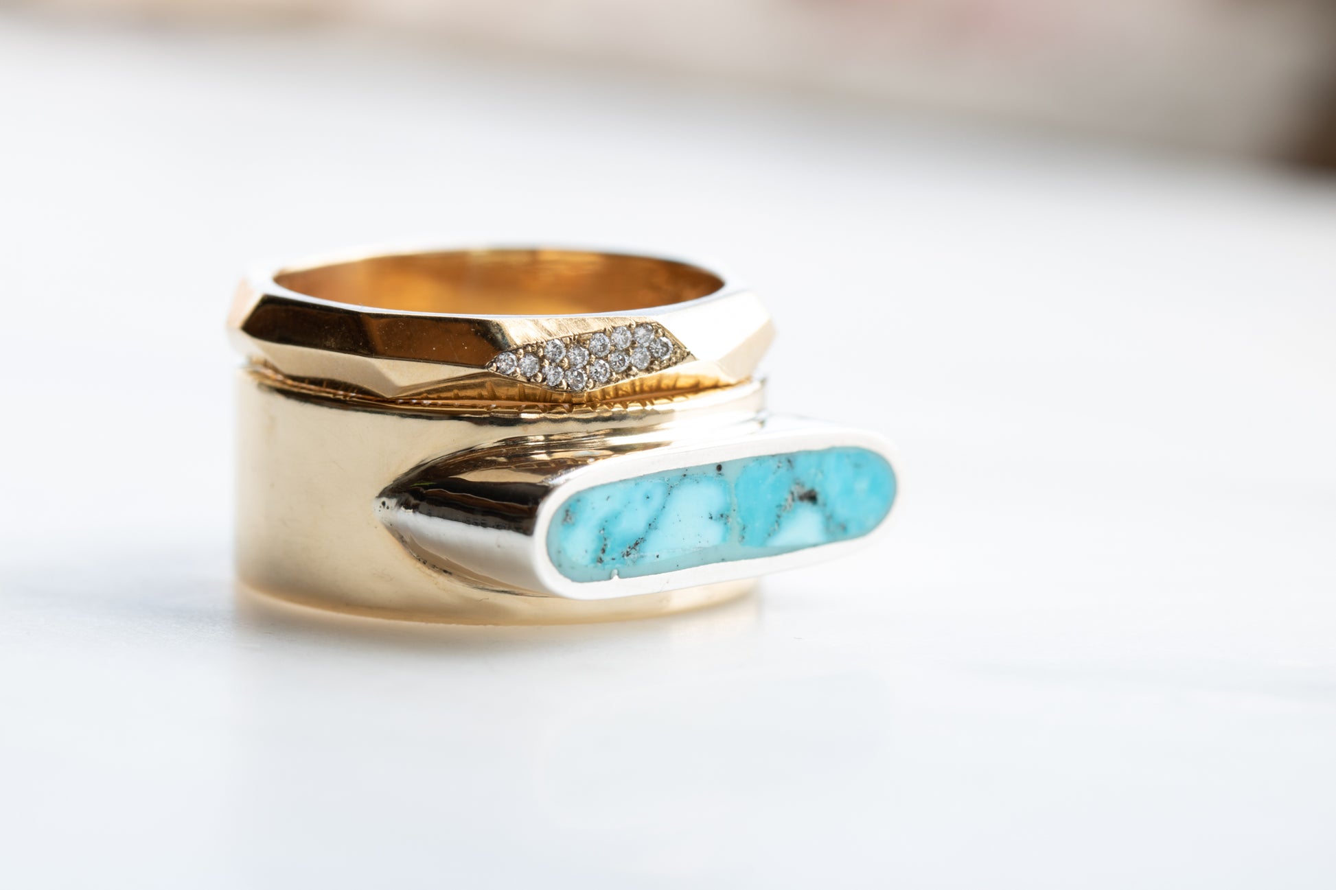 14k gold 8mm wide cigar band with an oval sterling silver top and Kingman turquoise inlay, size 6.75. (email to request custom size)