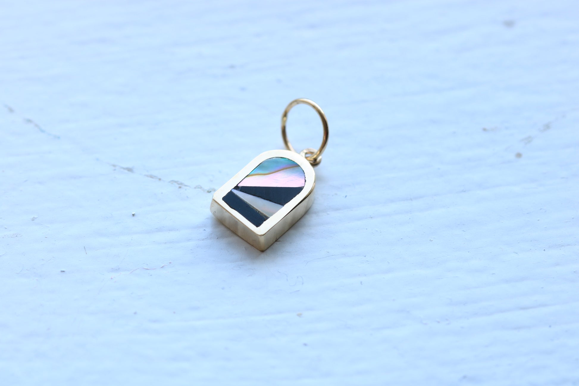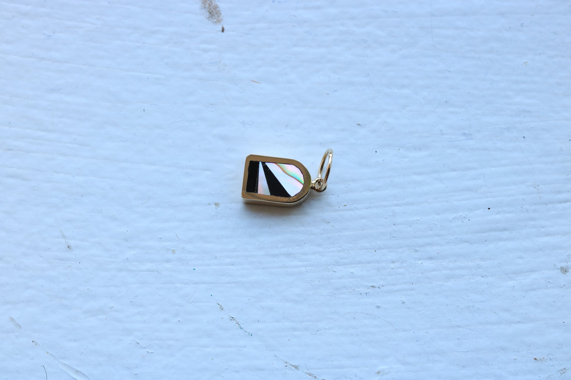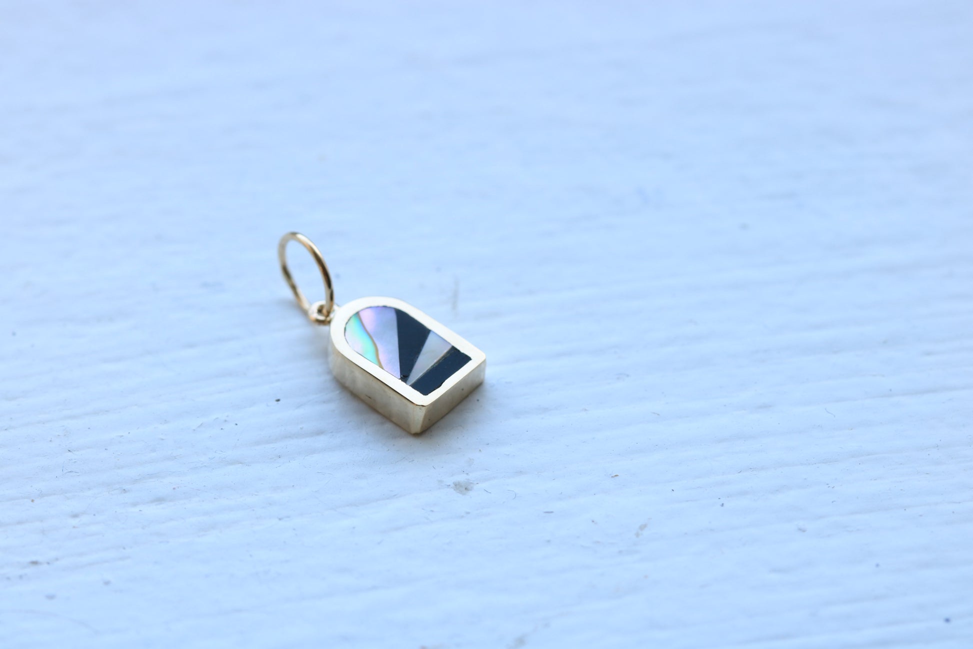 14k solid gold charm with 1970's abalone and black petrified wood inlaid in a fan pattern! Window frame is 11mm long by 7mm wide.