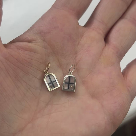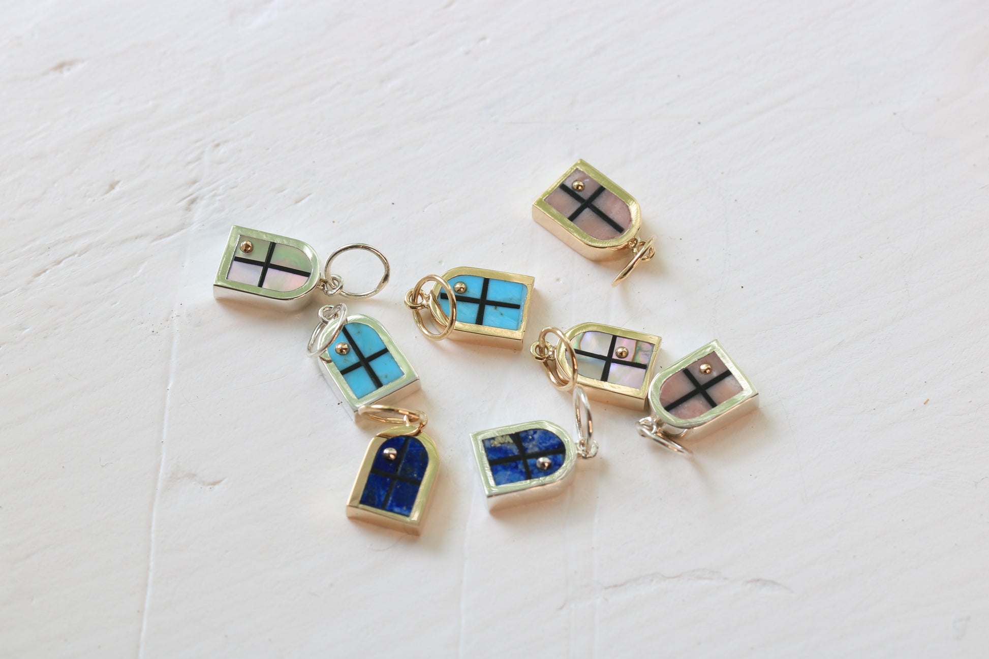 Solid 14k yellow gold window inlaid with black petrified wood, Peruvian pink opal, and a 14k gold low sun.