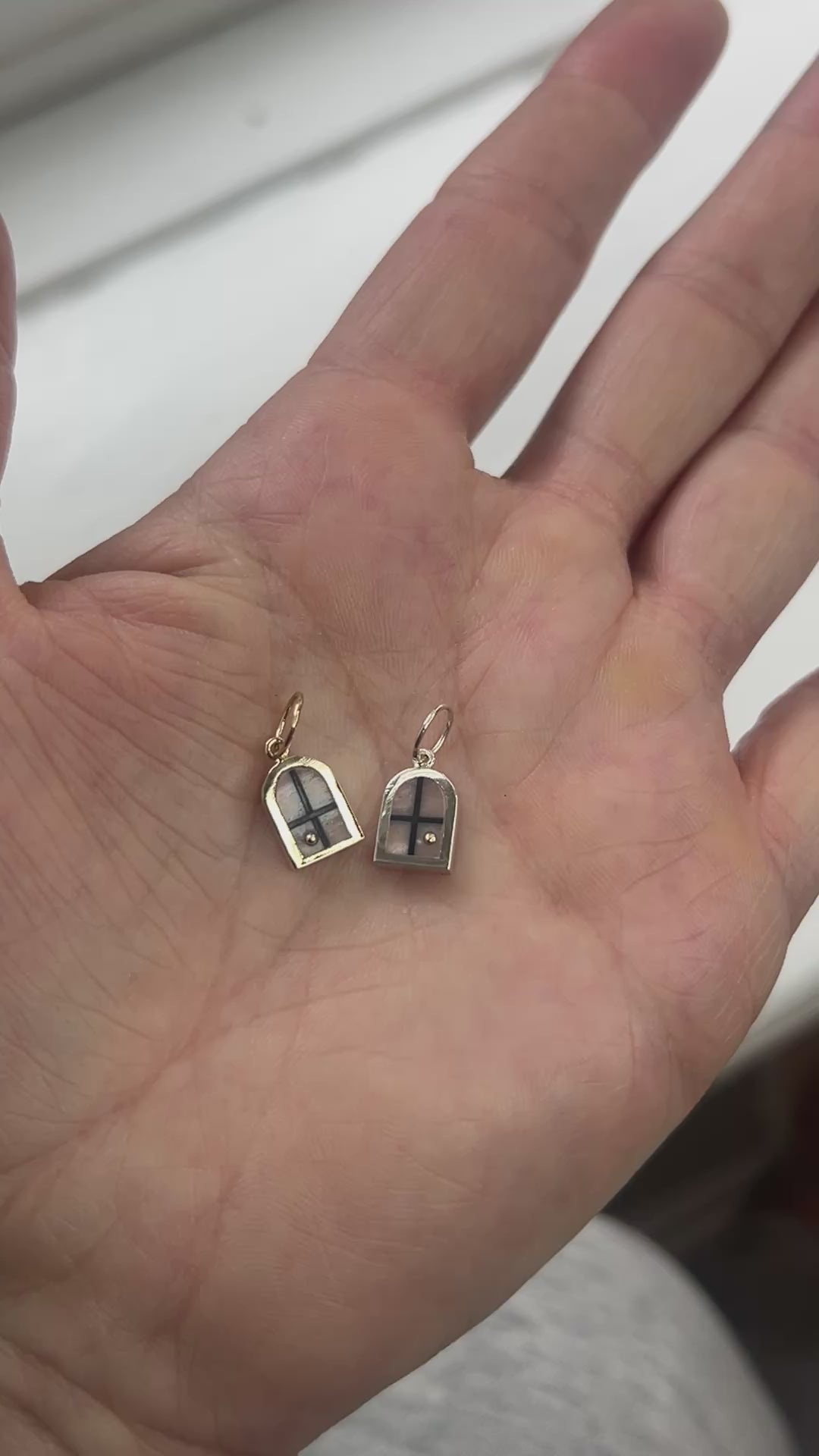 Sterling silver window charm inlaid with black petrified wood, Peruvian pink opal, and a 14k gold low sun.