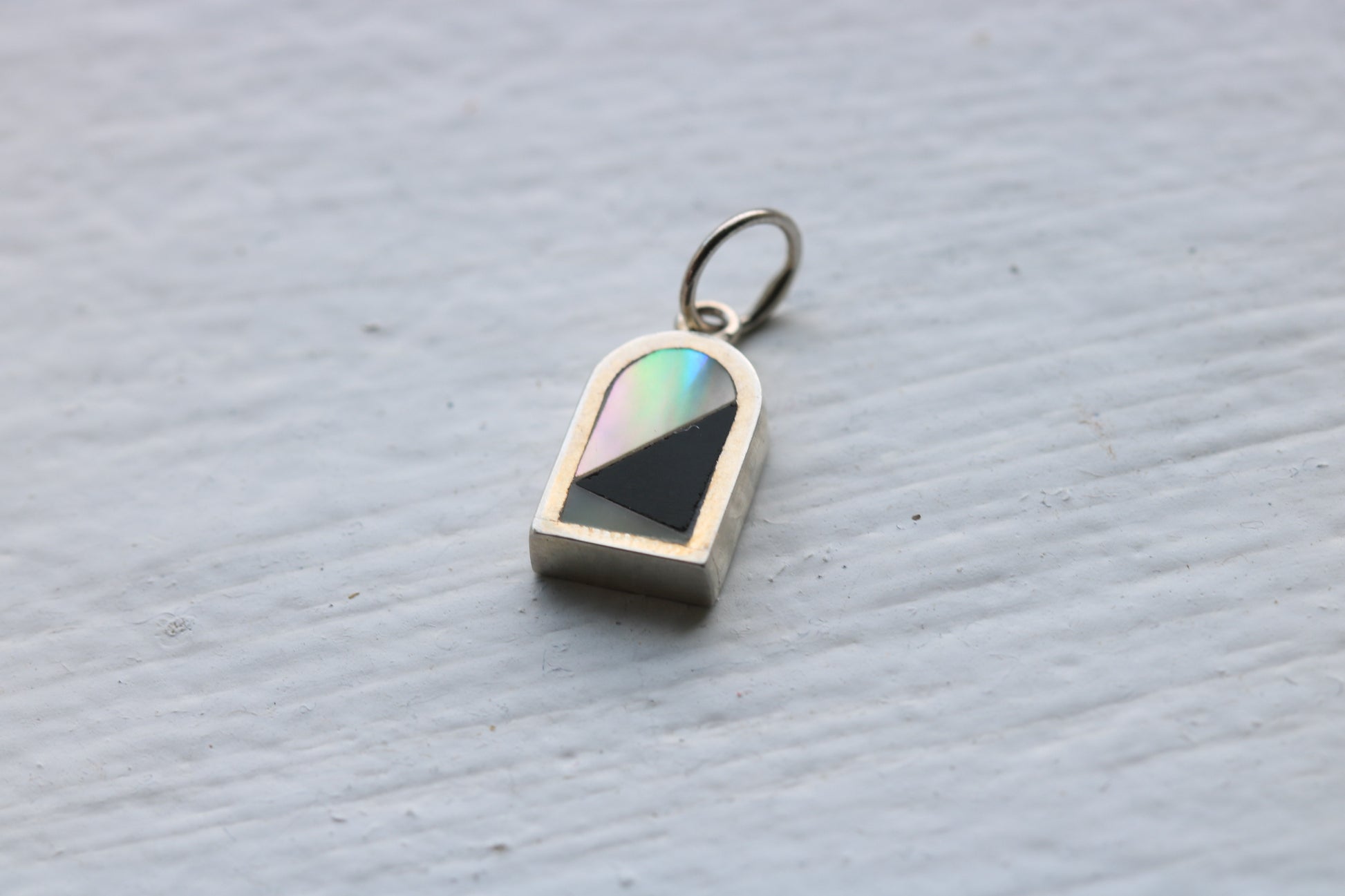 Sterling silver with black petrified wood and abalone inlay. Bail has a 5mm opening. Comes on a silver box chain!